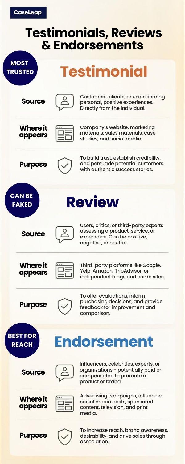 People often use the terms testimonial, review, and endorsement interchangeably. However, they describe slightly different types of customer feedback. All extremely useful when each is used strategically.